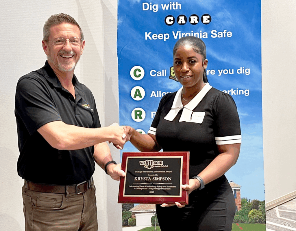 The Virginia 811 Damage Prevention Ambassador Award is intended to recognize and celebrate individuals who actively engage in initiatives that reduce the risk of utility damage during excavation projects, go above and beyond in promoting safe excavation practices, and foster a culture of safety and education within their community.
