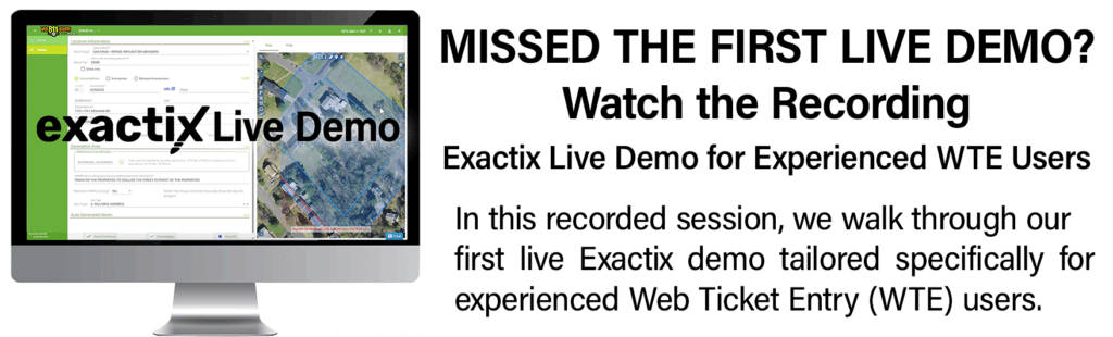 As part of this transition, we’ve begun onboarding current Web Ticket Entry (WTE) users through a tiered rollout approach. Keep an eye out for an email detailing when you will be invited to take part in a short series of educational videos introducing the new Exactix Web Ticket Entry platform. If you have not yet received an email but are interested in starting training, please send an email to WTE@VA811.com.