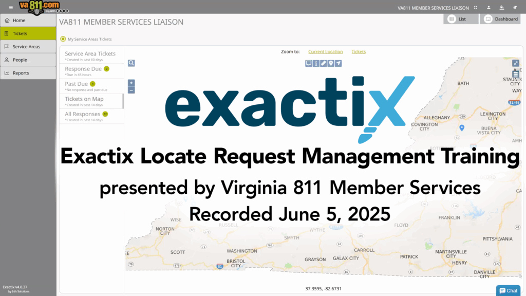 - Chat Feature: The new Exactix Chat feature connects you with a live Virginia 811 team member — no AI, just real help! Use it anytime while navigating Exactix for quick, friendly assistance during normal business hours.