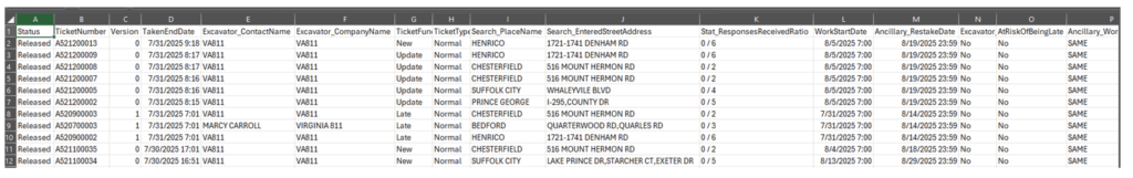 This spreadsheet can be used to track and review locate request submissions collaboratively. It’s a simple way to stay organized and maintain visibility without requiring direct access through Virginia 811.